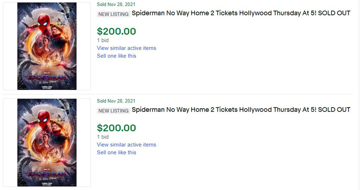 На аукционе eBay, пишет издание, билеты на «Нет пути домой» пытаются перепродавать за тысячи или даже десятки тысяч долларов. Например, самый дорогой из предлагаемых билетов сейчас стоит 1.7 миллиона рублей.