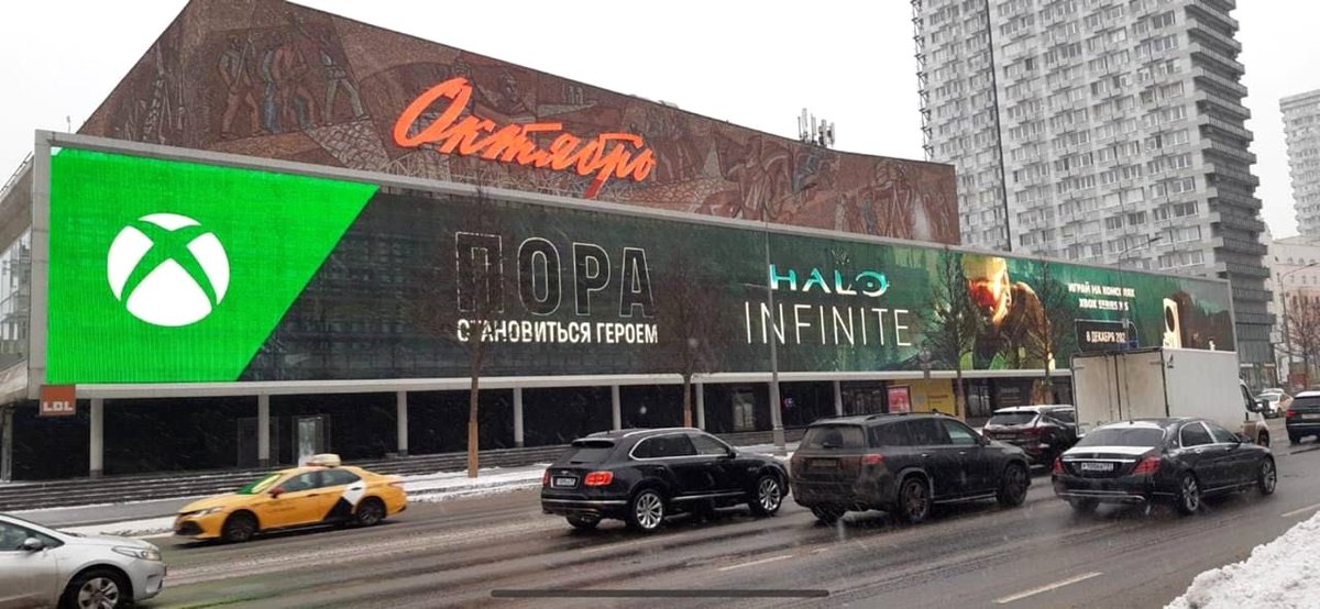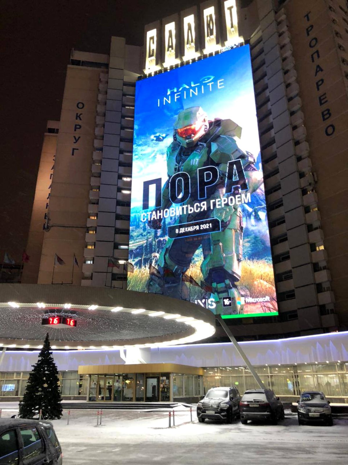 В России началась рекламная кампания Halo Infinite. Промо игры появилось на нескольких московских площадках: в частности, его можно увидеть на большом светодиодном экране кинотеатра «Октябрь».