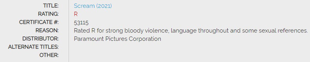 В отличие от предыдущих фильмов, новый «Крик» получил взрослый рейтинг не только за кровавые сцены насилия и крепкие выражение, но и за «отсылки сексуального характера». Рейтинговая организация не приводит подробности.