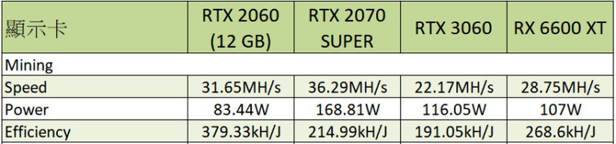Помимо игр видеокарта была протестирована в майнинге Ethereum. Здесь GeForce RTX 2060 с 12 гигабайтами памяти показывает отличную экономичность, превосходя Radeon RX 6600 XT и GeForce RTX 2070 Super.