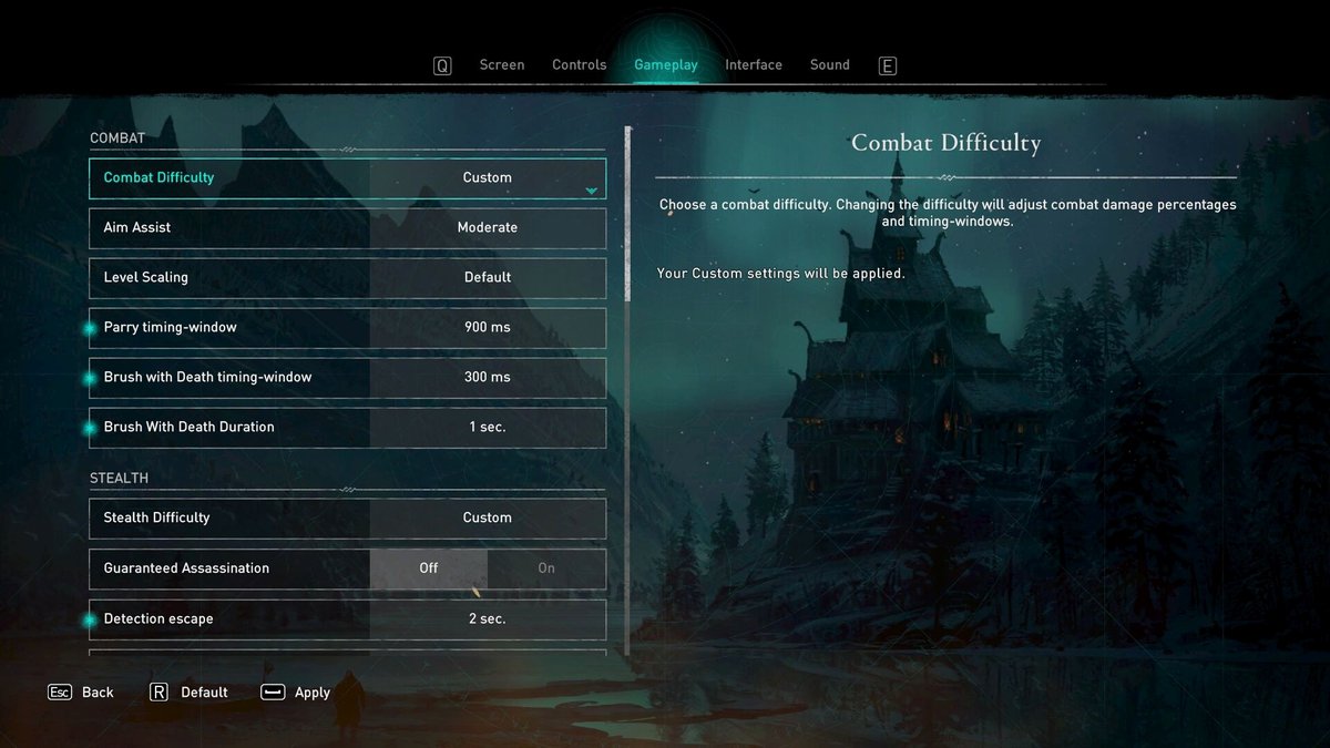 Настройки боевой системы дают возможность корректировать тайминги парирования (от 0.4 до 0.8 секунды), тайминги умения, позволяющего уворачиваться с замедлением времени (от 0.3 до 0.6 секунды), и продолжительность этого замедления (от 1 до 2.5 секунды).