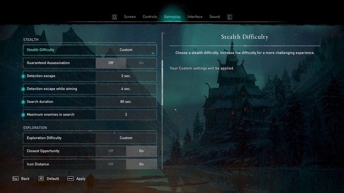 Настройки стелса позволят управлять максимальным количеством противников, пытающихся найти главного героя (2 или 3), продолжительностью поиска (от 50 до 80 секунд), временем до обнаружения в обычном режиме (от 0.5 до 2 секунд) и временем обнаружения во время прицеливания (от 1 до 4 секунд).
