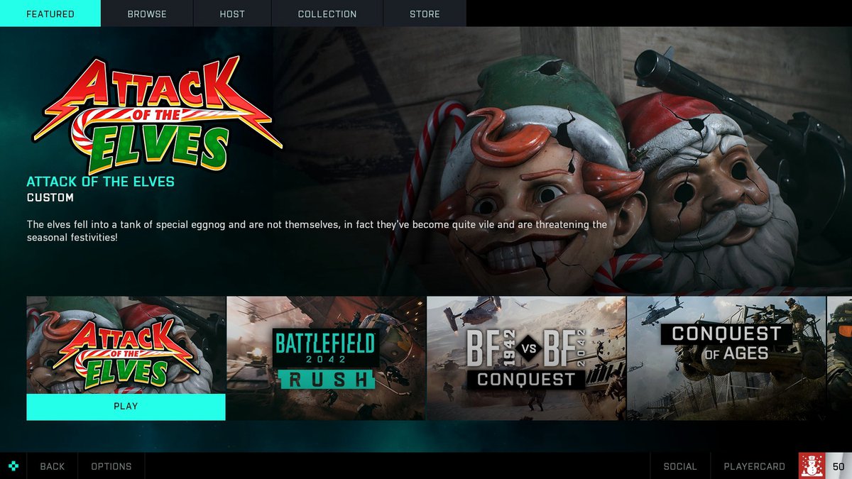 В Battlefield 2042 Portal появился временный новогодний режим «Атака эльфов». В режиме сражаются команды эльфов и Санта-Клаусов, в матче участвуют не больше 32 игроков — по 16 в команде.