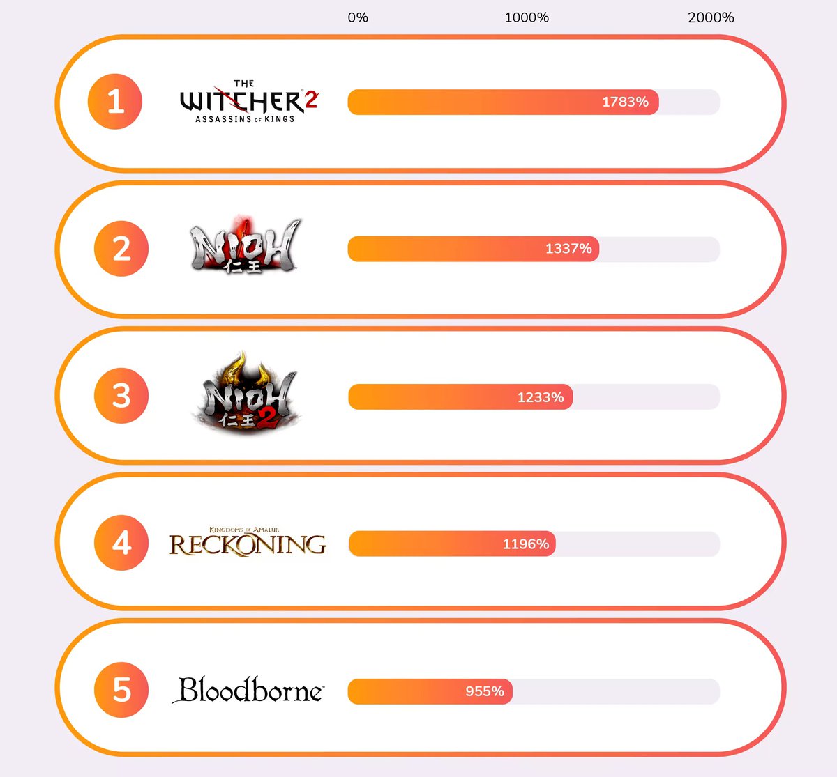 Среди лидеров по уровню наценки оказались две части NiOh, Kingdoms of Amalur: Re-Reckoning и Bloodborne. Торговцы из Bloodborne установили рекорд по наценке на лечебные предметы: 2150%.