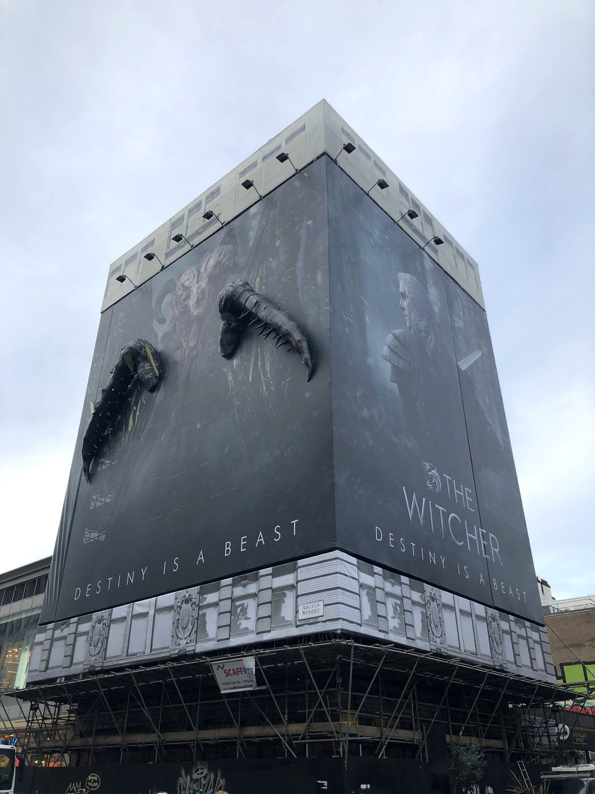 Иногда вдобавок к статуям города получали необычные рекламные баннеры. Например, в Глазго можно увидеть вот такой баннер — с реальными лапами монстра, появившимися на здании.
