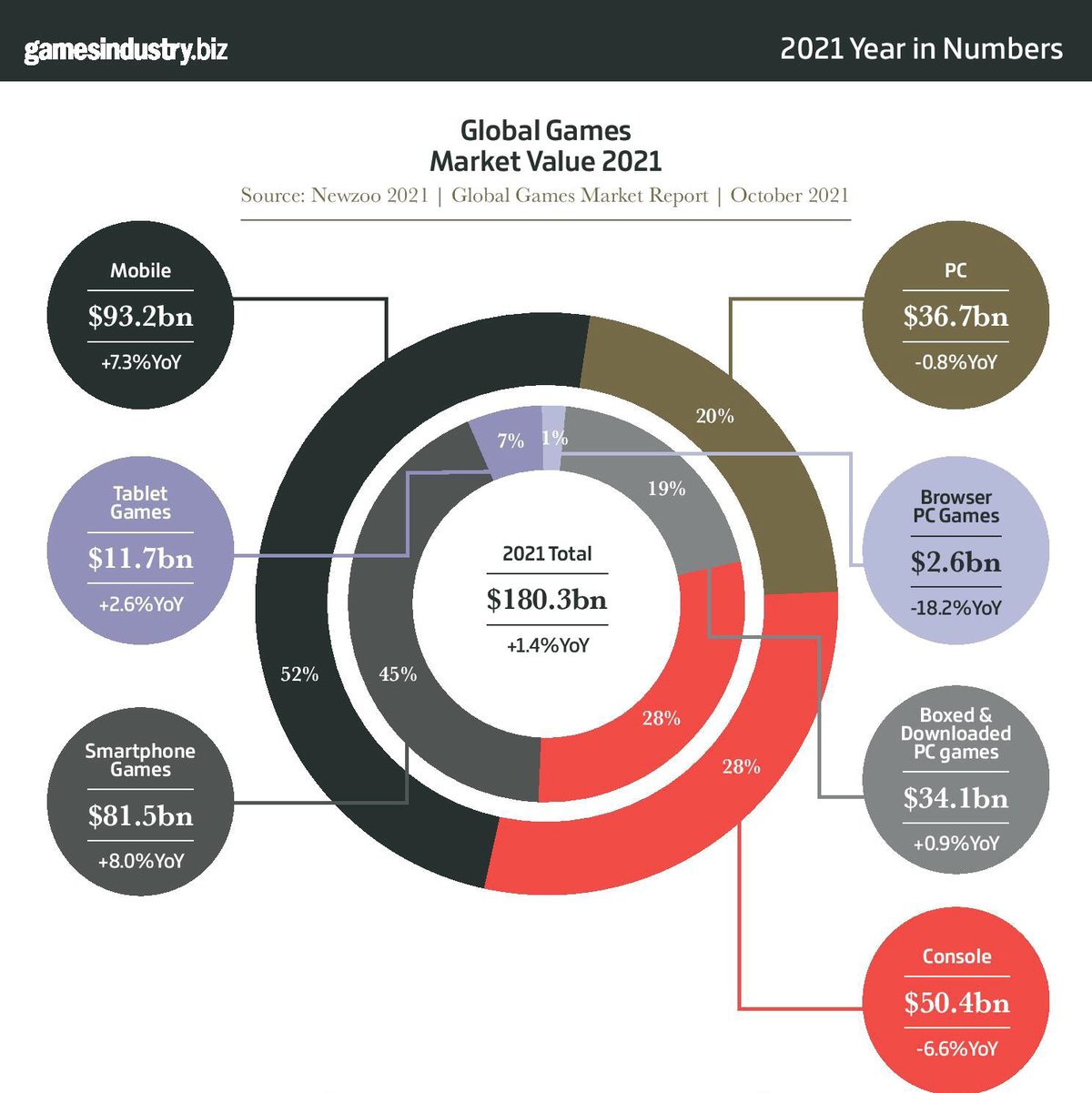 Редакция GamesIndustry опубликовала ежегодную инфографику, описывающую состояние игровой индустрии. В 2021 году ее выручка увеличилась на 1.4% и достигла $180.3 миллиарда.
