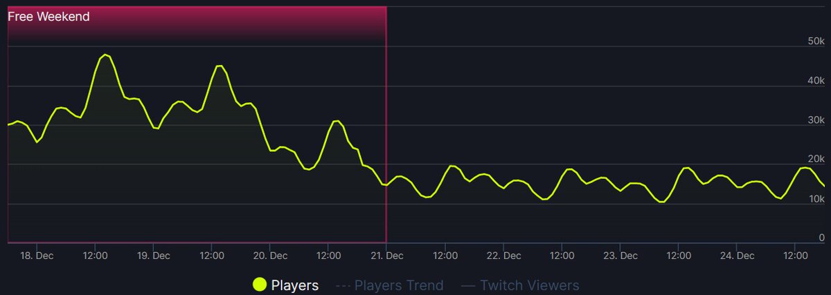 В то же время Battlefield 2042 после бесплатных выходных показывает снижение аудитории. 24 декабря пиковый онлайн в игре оказался на уровне предыдущего дня, а не значительно выше, как у Battlefield V.