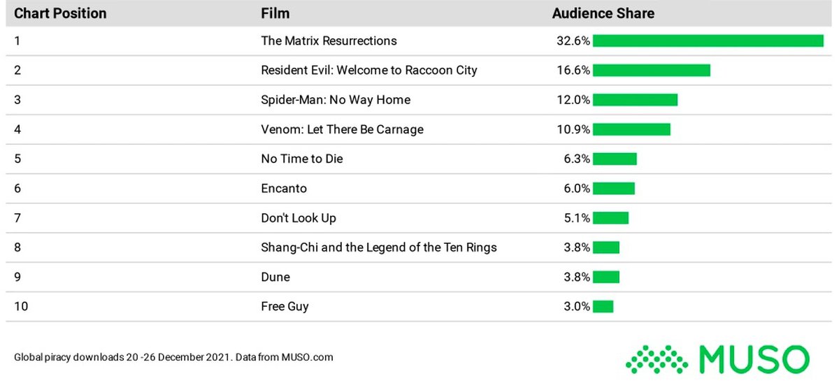 На десяти самых популярных трекерах — их названия не приводятся — «Матрица» привлекла 32.6% аудитории. Для сравнения: у экранок фильма «Человек-паук: Нет пути домой» этот показатель составляет 12%.