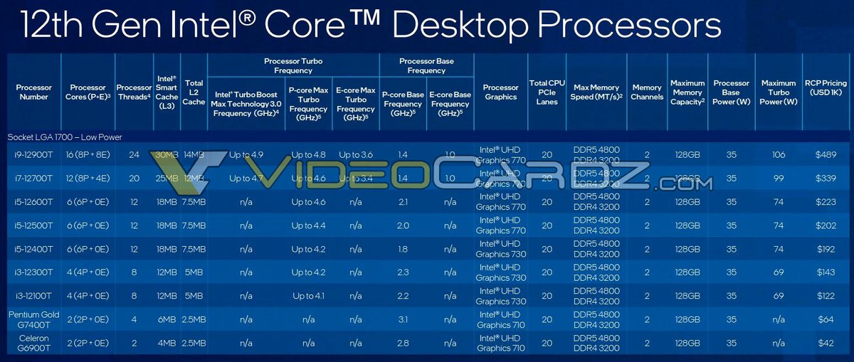 Речь идет о процессорах Alder Lake-S с энергопотреблением 65 Вт и 35 Вт. В общей сложности Intel планирует анонсировать 22 процессора; самый дешевый из них стоит $42, самый дорогой — $489; впрочем, это рекомендуемые, а не реальные розничные цены.