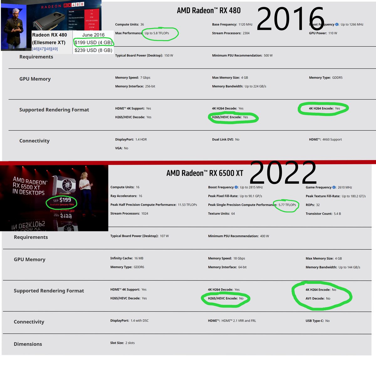 Участники сабреддита AMD обнаружили, что по ряду параметров Radeon RX 6500 XT уступает не только своей предшественнице, Radeon RX 5500 XT, но и видеокарте Radeon RX 480, выпущенной в продажу в 2016 году. Примечательно, что рекомендуемая цена Radeon RX 480 составляла те же $199.