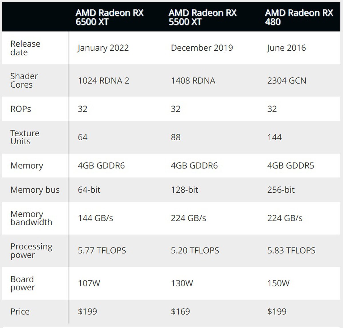 Правда, здесь нет рабочих частот — они у Radeon RX 6500 XT выше, чем у предшественников. Однако по чистой производительности, оцененной самой AMD, Radeon RX 6500 XT все равно немного уступает Radeon RX 480.