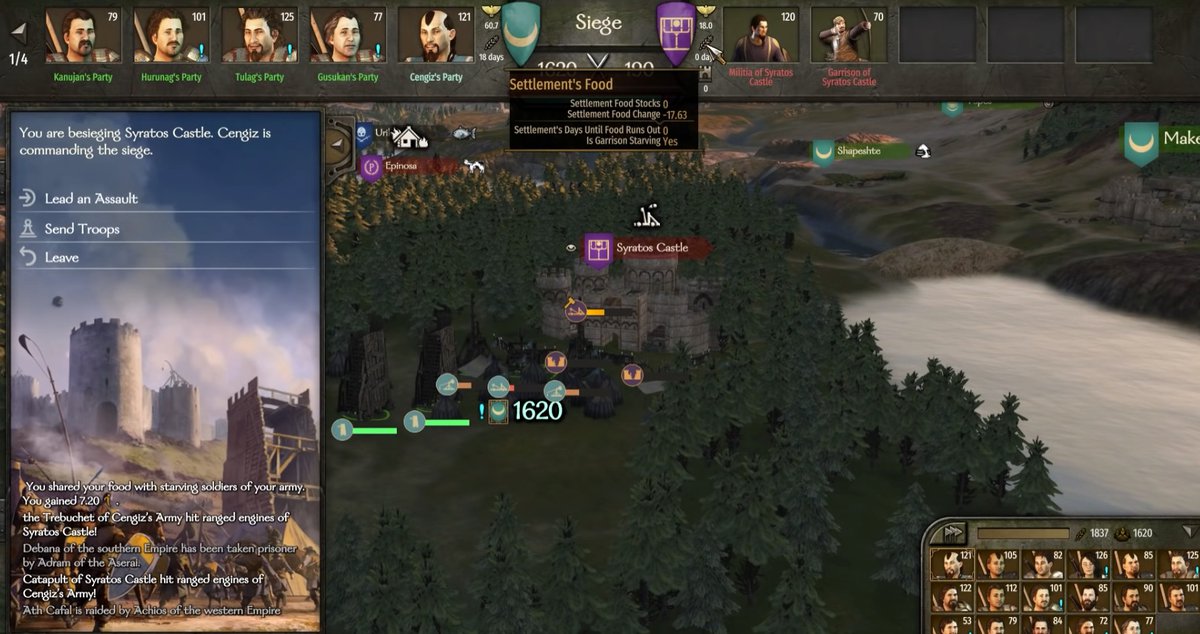 Улучшены осады. Солдаты осажденного гарнизона теперь не умирают от недостатка еды, а теряют здоровье, но продолжают есть. Интерфейс показывает, сколько еды есть на рынке — стало проще понять, когда настанет голод. Поведение искусственного интеллекта во время осад тоже доработали.