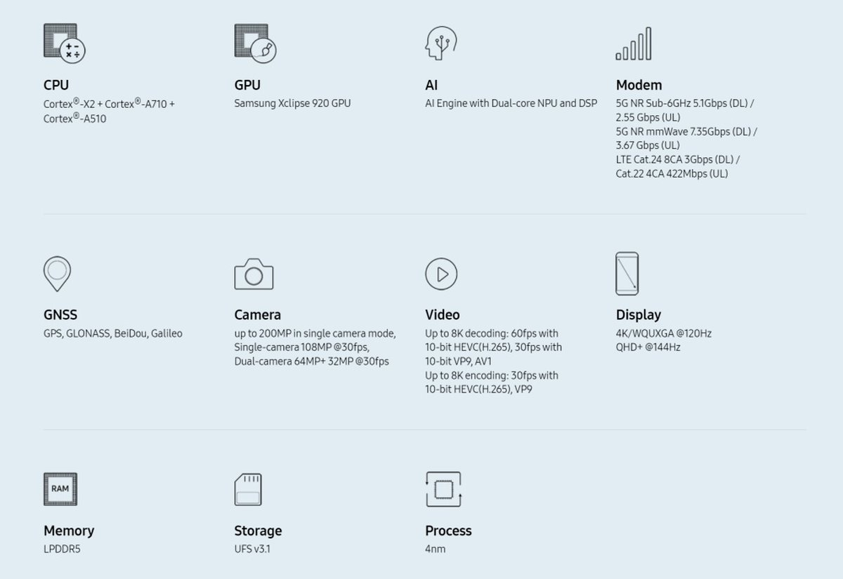 Подробные технические характеристики чипа пока не раскрыты. Известно, что Exynos 2200 может быстрее проводить вычисления, связанные с нейронными сетями, и поддерживает все современные стандарты связи, включая 5G.