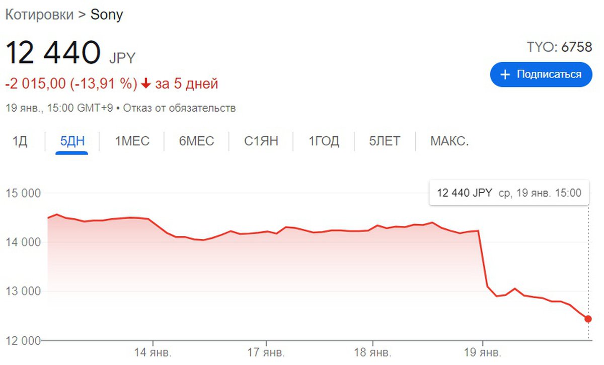 Стоимость акций Sony Group Corporation за последние сутки упала более чем на 13.9%. Падение капитализации компании началось после того, как Microsoft объявила о покупке холдинга Activision Blizzard.