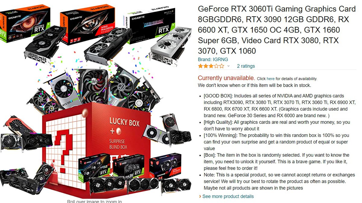 В японской версии интернет-магазина Amazon начали предлагать покупателям лутбоксы с видеокартами, пишет IT Home. В лутбоксе может попасться как новейшая видеокарта, так и одно из устаревших устройств.