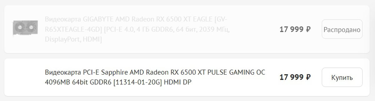 Radeon RX 6500 XT продают за 17999 рублей, это почти рекомендованная цена. Карты раскупили