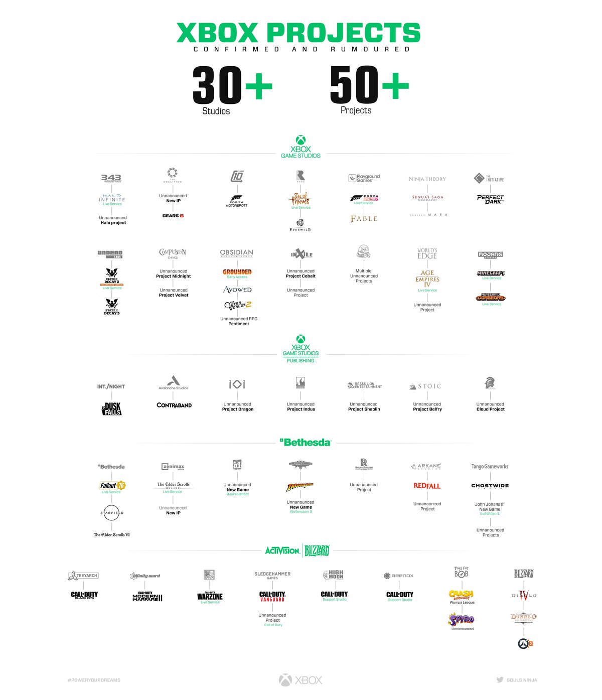 Фанаты создали инфографику, описывающую все основные студии Microsoft и пока еще независимой Activision Blizzard, а также проекты, которыми они занимаются. Оказалось, под контролем Microsoft вскоре окажется больше 30 студий, разрабатывающих свыше 50 игр.