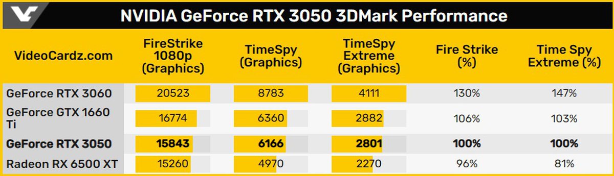 Редакция VideoCardz получила результаты прогона видеокарты GeForce RTX 3050 в бенчмарках 3DMark. По производительности в традиционном рендеринге карта сопоставима с GeForce GTX 1660 Ti.