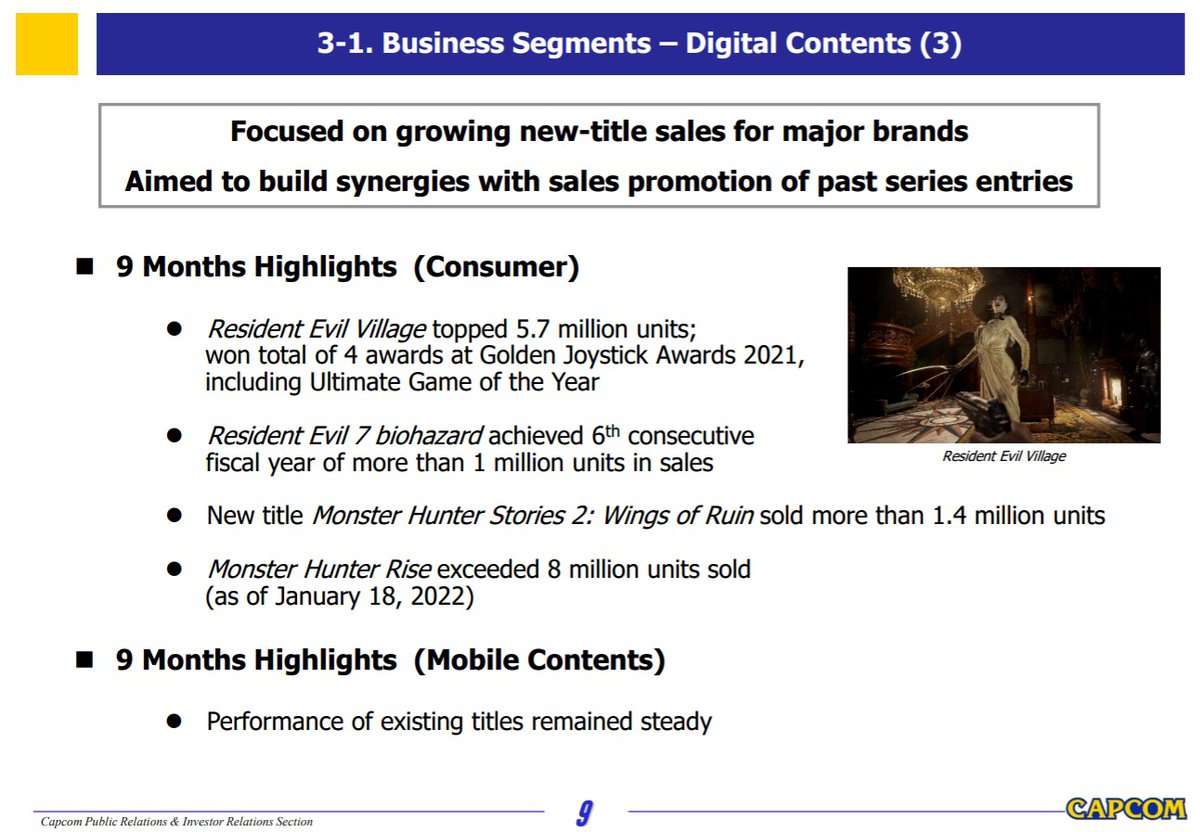 Компания Capcom опубликовала отчет за третий финансовый квартал, закончившийся 31 декабря 2021 календарного года. В отчете сообщается, что продажи Resident Evil Village превысили 5.7 миллиона копий.