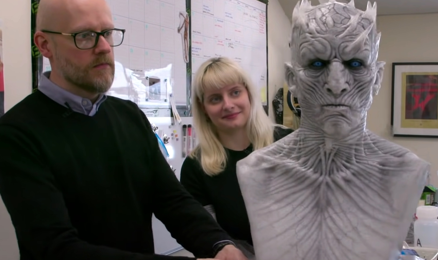 На роль Короля Ночи еще никого не утвердили, так что вместо снятия слепков с лица актера специалисты по гриму создали скульптуру из стеклопластика и эпоксидной смолы. И уже поверх неё создавали силиконовые накладки, на приклеивание и подкрашивание которых уходило порядка четырёх часов.