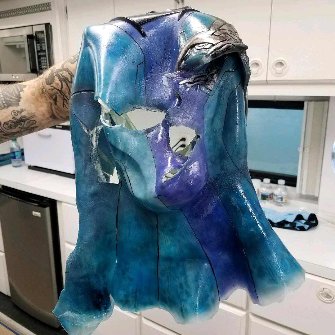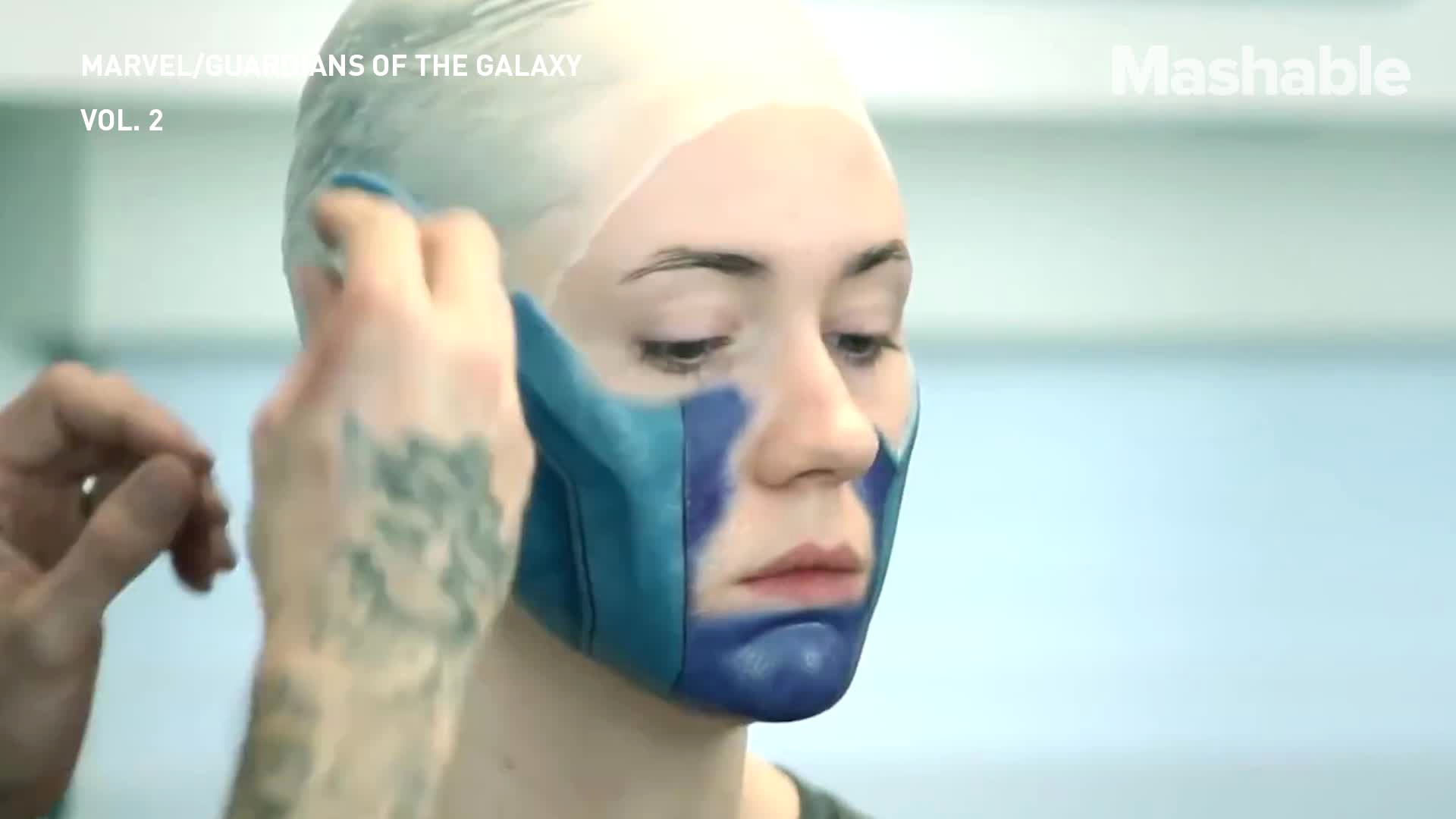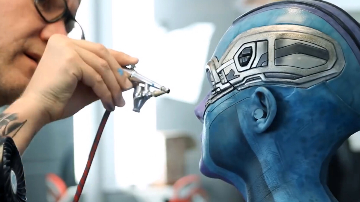 Чтобы приклеенные силиконовые части не превратились в сплошную маску и не лишили героиню эмоций, зоны глаз, носа, ушей и рта просто закрашивали синей краской, а текстуру рисовали с помощью краскопульта. Точно так же делали с руками и ладонями. Образ завершался 22-миллиметровыми чёрными контактными линзами и, как ни странно, накладными ресницами.