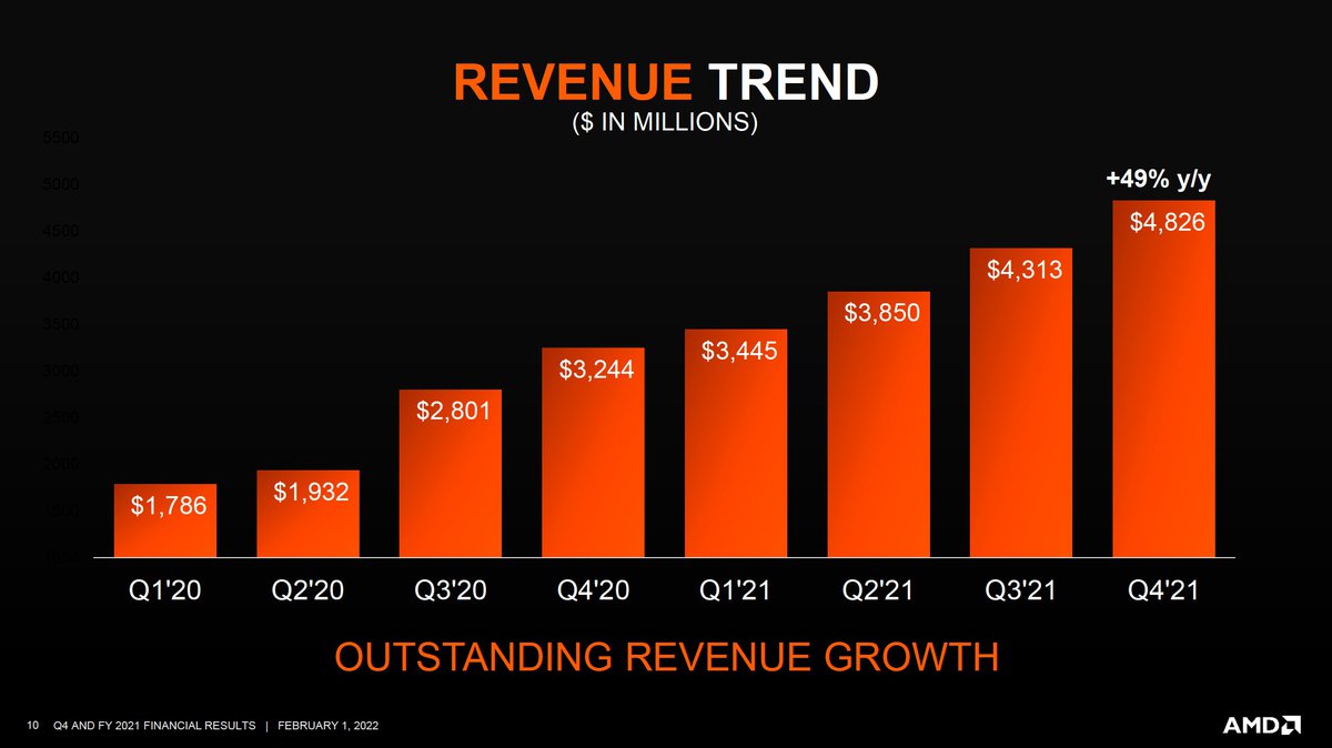 Квартальная выручка AMD выросла на 49%, до $4.8 миллиарда. За год компания заработала $16.4 миллиарда, это на 68% больше, чем в 2020 году.