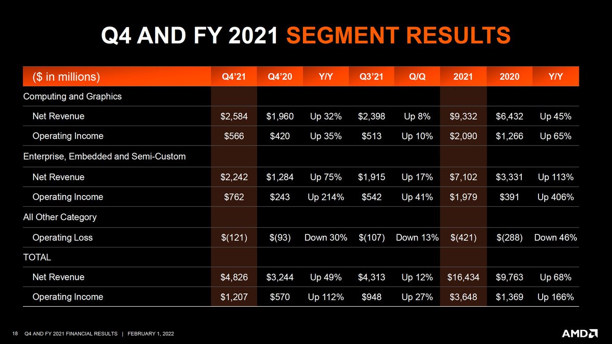 AMD опубликовала отчет за последний квартал 2021 года и весь год в целом. И квартал, и год оказались для компании рекордными.