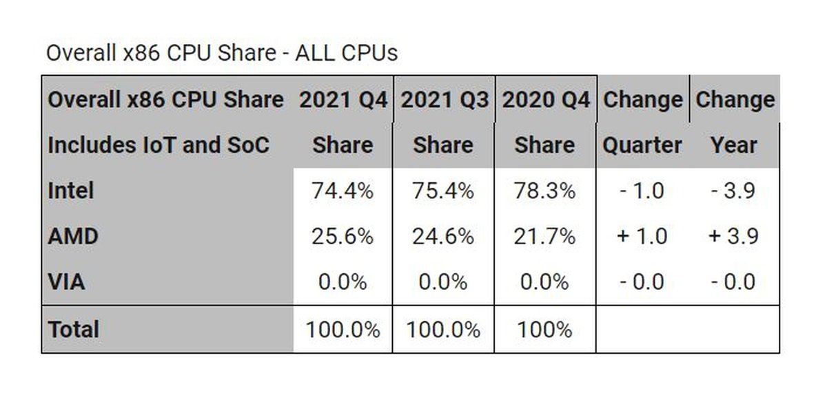 В последнем квартале 2021 года доля AMD на рынке процессоров достигла 25.6%, следует из отчета исследовательской компании Mercury Research. Это значит, что AMD удалось побить собственный рекорд, державшийся 15 лет.