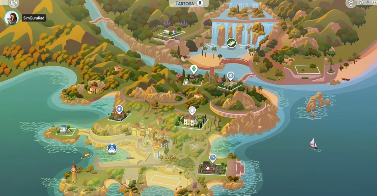Вот так выглядит новый мир, Тартоса, где симы будут играть свадьбы. Здесь есть два свободных участка земли, два стартовых дома и свадебная инфраструктура. На скриншоте видно, что дом можно построить прямо на пляже.
