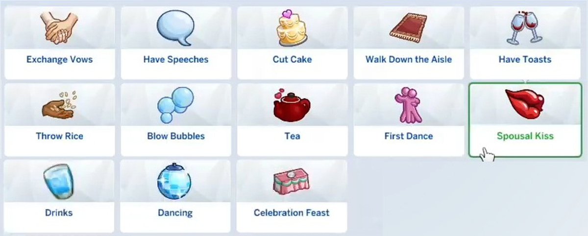 - Симы по-разному реагируют на поцелуи, обмен клятвами, разрезание торта и другие события во время свадьбы.