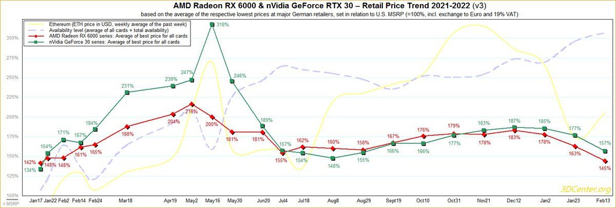 Если динамика останется прежней, то уже в ближайшие недели стоимость карт может оказаться ниже, чем в январе 2021 года. Тогда 3DCenter был зафиксирован минимальный уровень наценок за всю историю наблюдений.