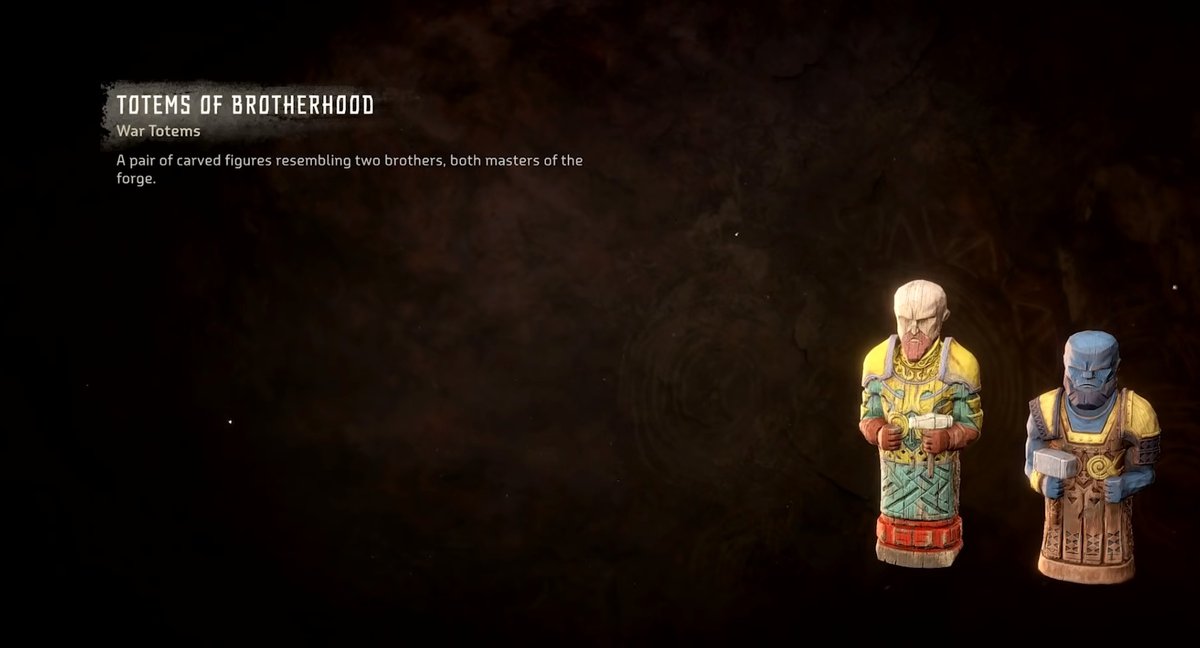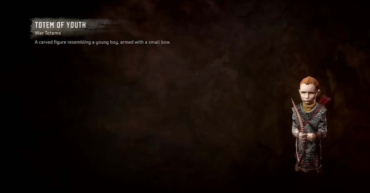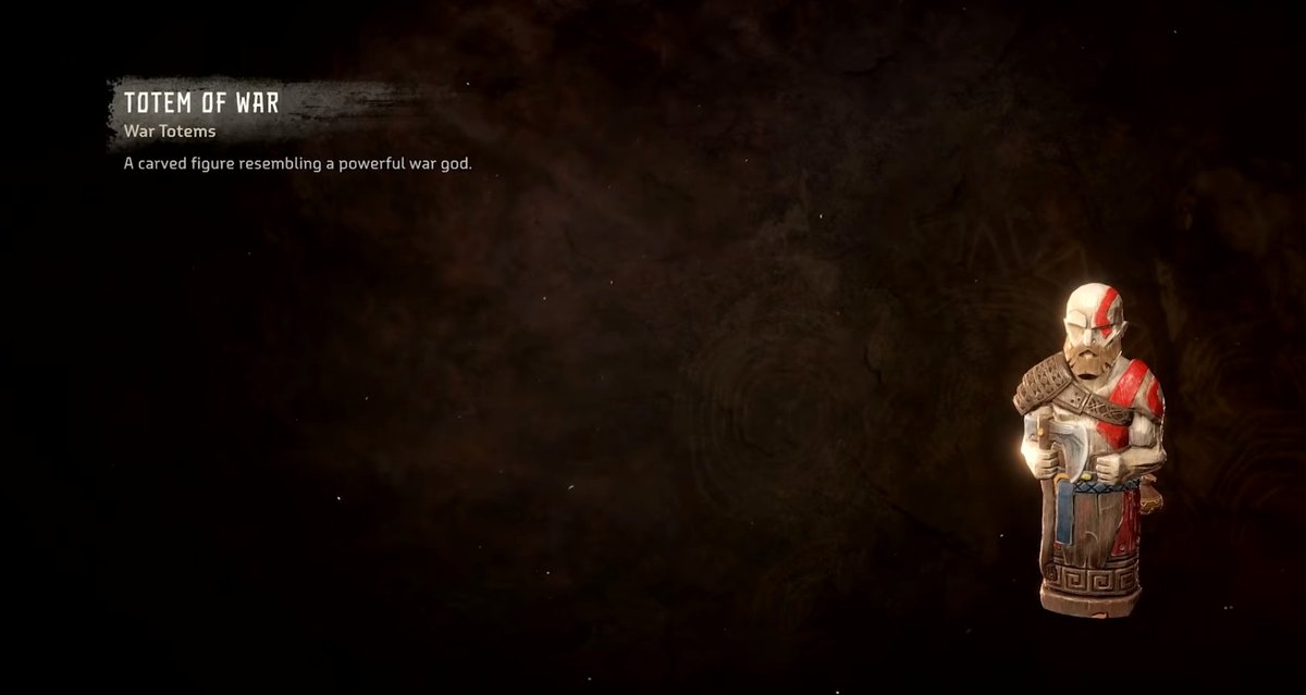 - Тотем Войны, фигурка с изображением «могущественного бога войны». Она лежит у заснеженного допа, напоминающего дом Кратоса. Попасть к дому можно по следам от топора из первого пункта.