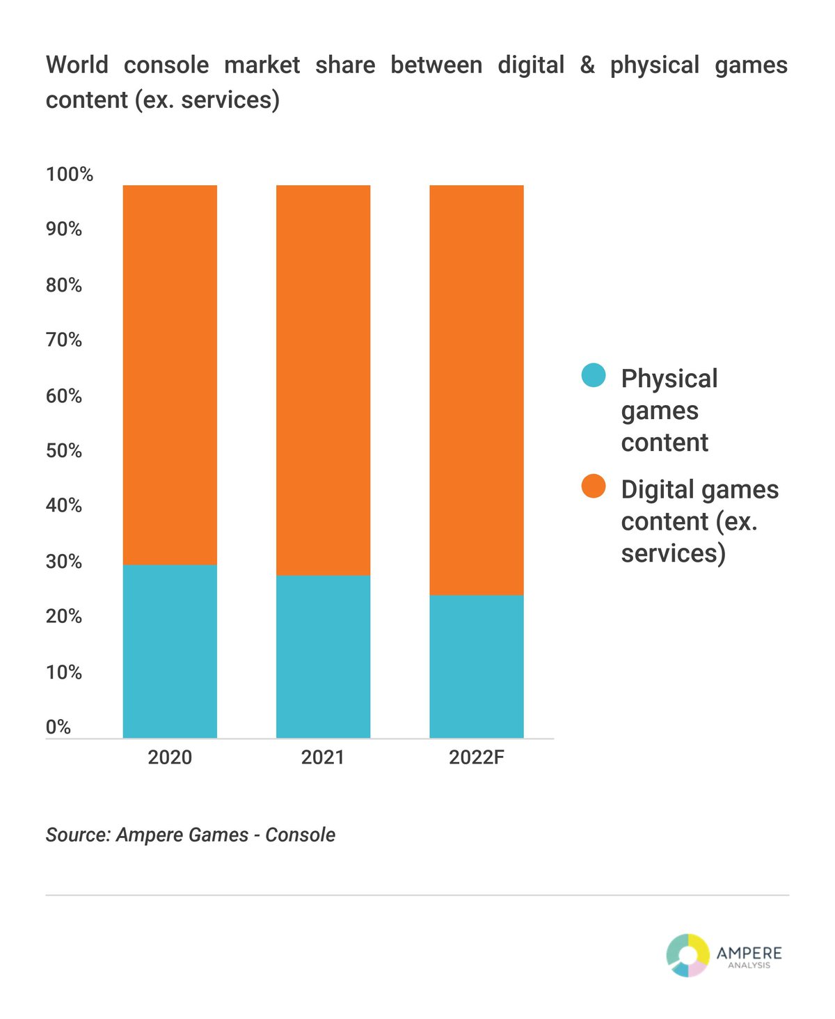 Продажи игр на физических носителях продолжают падать, сейчас на них приходится меньше 30% выручки. Активнее всего игры на физических носителях покупают владельцы Nintendo Switch.