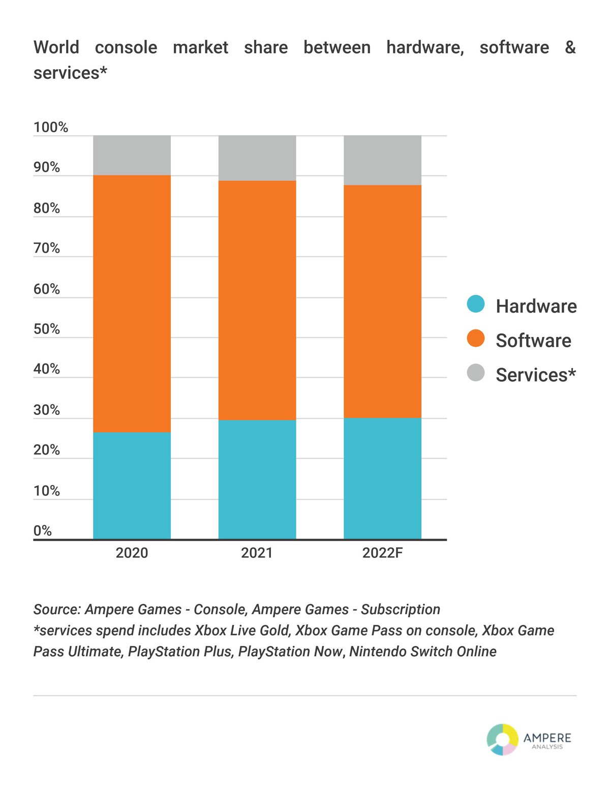 Ключевым игроком рынка стала Sony: как полагают аналитики, она контролирует 46% рынка, с 2020 года немного нарастив свою долю. На втором месте Nintendo с 29%, потерявшая 2% за год, на третьем — Microsoft с 25%, набравшая 1%.