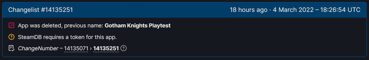 Некоторое время в магазине существовало скрытое приложение Gotham Knights Playtest. Судя по данным SteamDB, оно появилось в Steam в середине января 2022 года, а спустя полтора месяца было удалено.