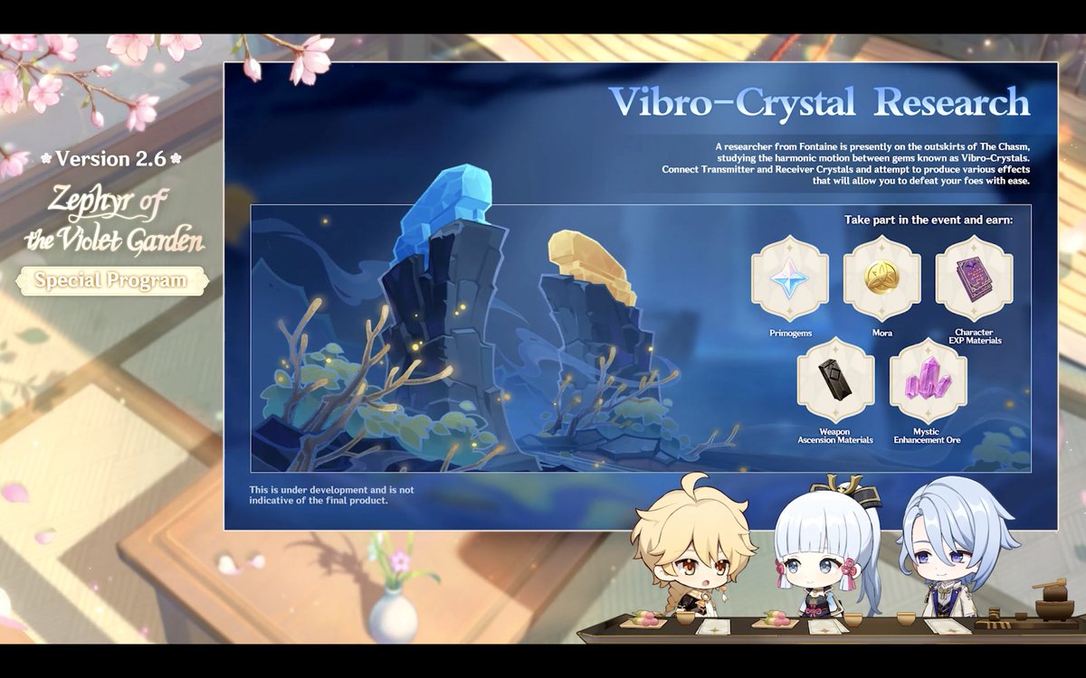 Основное событие обновления называется Оттенки фиолетового сада. Это фестиваль с несколькими мини-играми, участвуя в эвенте, игроки смогут заработать разнообразные ресурсы и бесплатно получить Син Цю, персонажа с 4 звездами редкости.