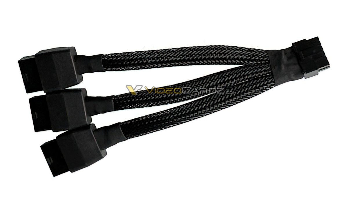 Мы уже знаем, как выглядит сам разъем, теперь редакция VideoCardz получила и изображение переходника. Чтобы запитать видеокарту через 12VHPWR со старого блока питания, переходник надо подключить к трем восьмипиновым разъемам.