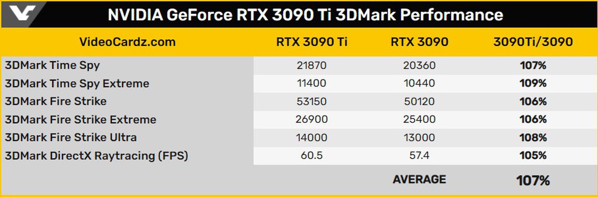 Также издание получило первые данные о производительности GeForce RTX 3090 Ti. В бенчмарках 3DMark карта в среднем на 7% быстрее GeForce RTX 3090.