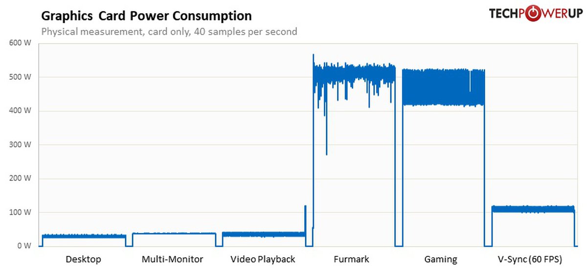 Под максимальной нагрузкой видеокарта потребляет больше 500 Вт, в среднем энергопотребление во время игры держится на уровне 469 Вт. Для сравнения: GeForce RTX 3090 потребляет в районе 355 Вт.