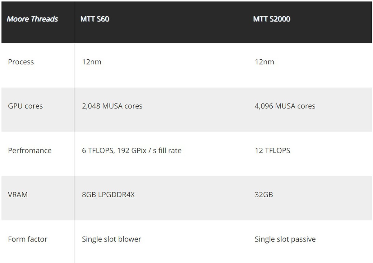 Графические чипы Moore Threads сделаны по 12-нм техпроцессу. Пока компания анонсировала две видеокарты, MTT S60 и MTT S2000; они оснащаются 8-32 гигабайтами памяти и несут на борту 2048-4096 вычислительных ядер.