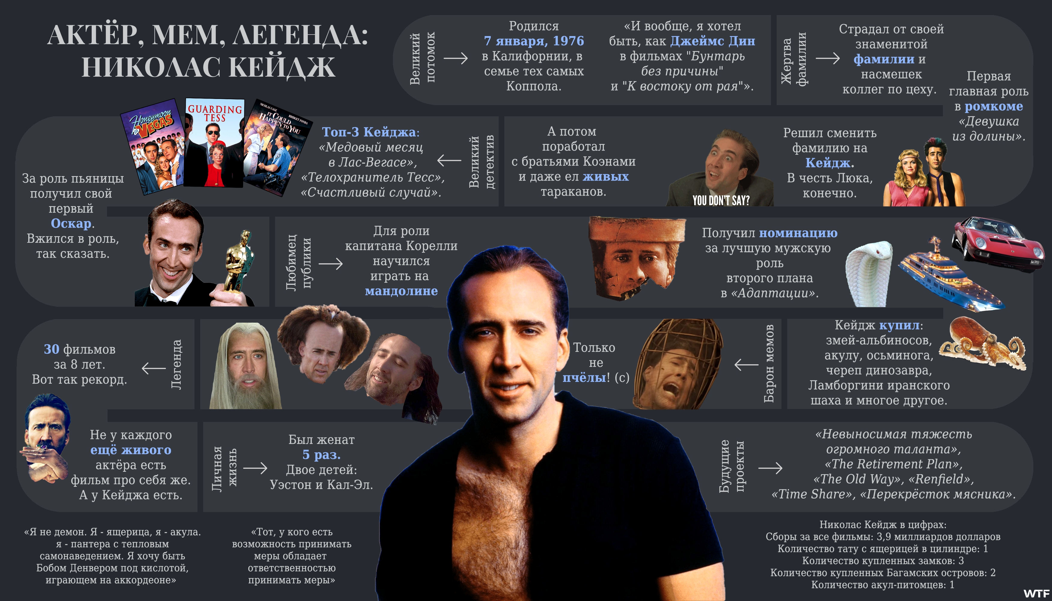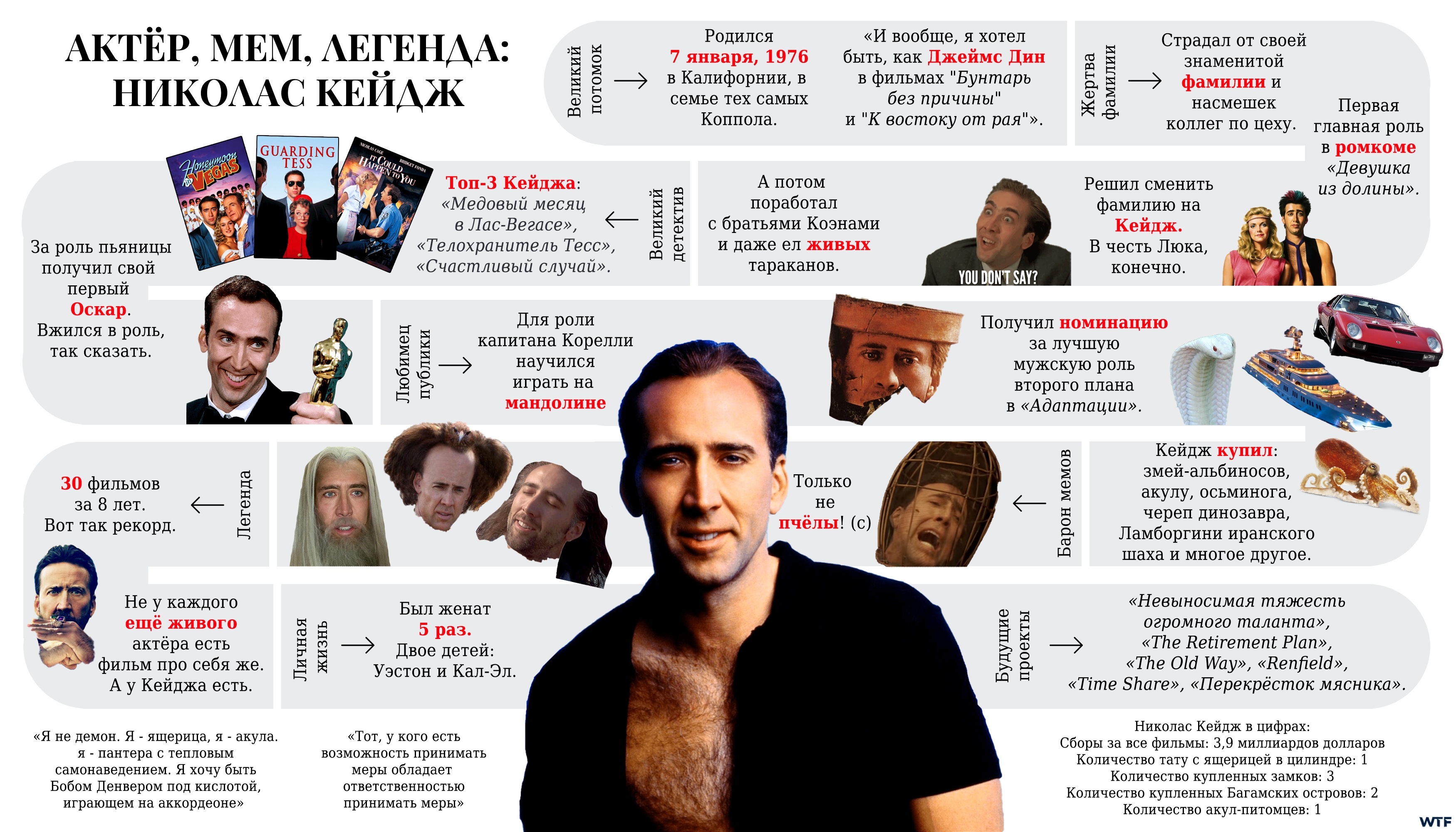 В честь выхода сатирического байопика «Невыносимая тяжесть огромного таланта» знакомимся с биографией Николаса Кейджа, узнаём, зачем ему высушенные головы пигмеев и почему он назвал своего сына в честь Супермена.