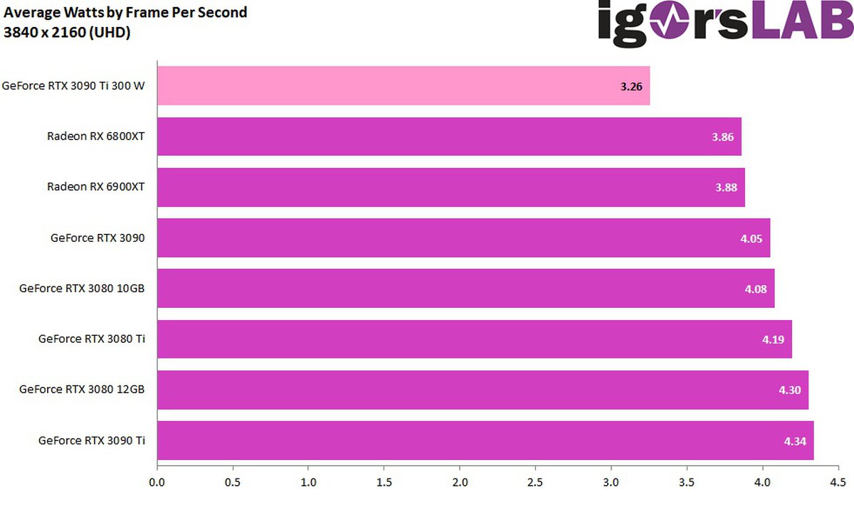На самом деле, отмечает Валлосек, GeForce RTX 3090 Ti с энергопотреблением в 300 Вт была самой энергоэффективной картой из всех протестированных. В среднем 1 кадр в секунду стоил карте 3.26 Вт. Без ограничения цифра превращалась в 4.34 Вт.