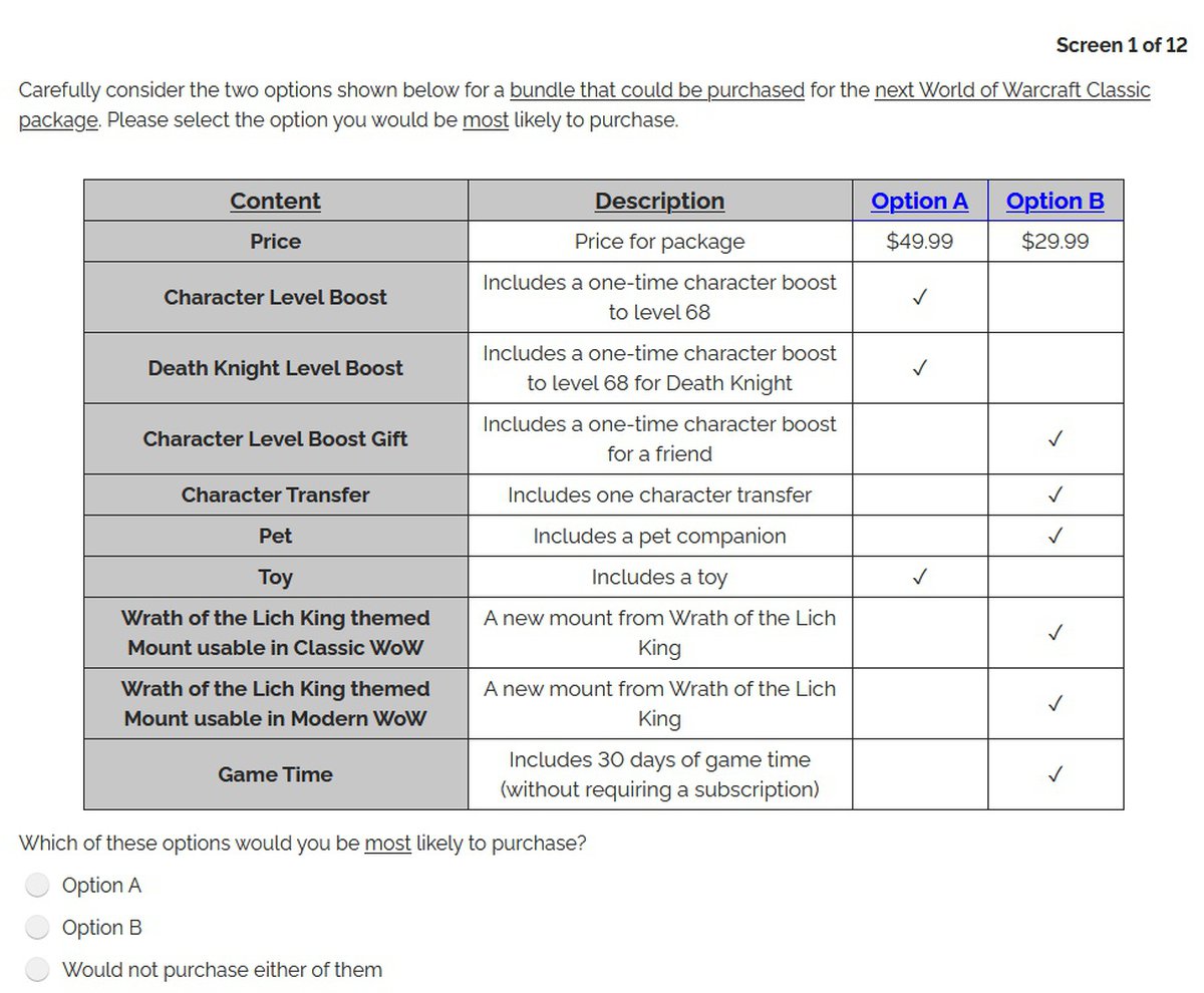 Blizzard Entertainment продолжает проводить опросы, связанные с запуском классических серверов World of Warcraft Wrath of the Lich King. Теперь компания интересуется, сколько должен стоить аддон и какие бонусы стоит к нему добавить.