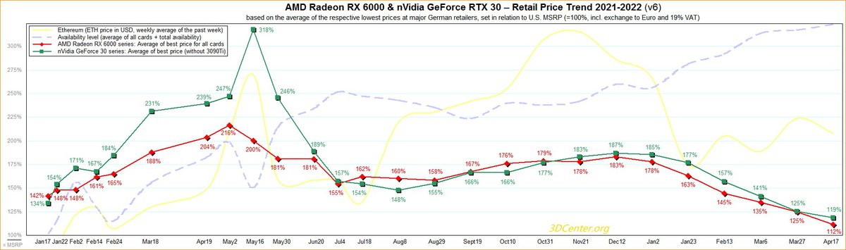 Редакция немецкого ресурса 3D Center продолжает фиксировать рекордное снижение стоимости видеокарт у ритейлеров Германии и Австрии. В конце марта были зафиксированы самые низкие значения за всю историю наблюдений, в апреле падение продолжилось.