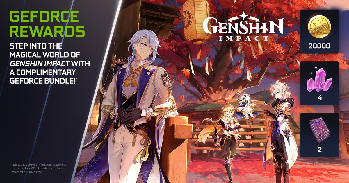 Nvidia и студия miHoYo запустили совместную промо-акцию. Владельцы видеокарт GeForce, пользующиеся приложением GeForce Experience, могут получить в Genshin Impact специальную награду, GeForce Bundle.