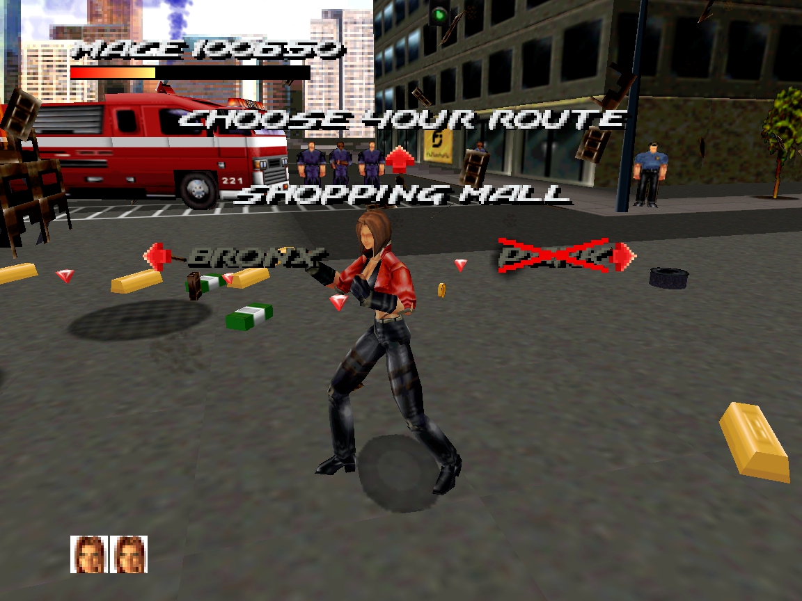 Падающие с разрушенных объектов и убитых врагов деньги и драгоценности увеличены в размерах и вращаются. Подобрав деньги или драгоценности на экране появляется надпись с количеством полученных очков. Отличие незначительное... До тех пор, пока не осознаёшь, что в данной версии за очки получаешь не только "продолжения", но и доступ к уровням развилок. Играя впервые, я не знал, что для прохода в парк, Бронкс и авиабазу нужно собрать n-количество очков.