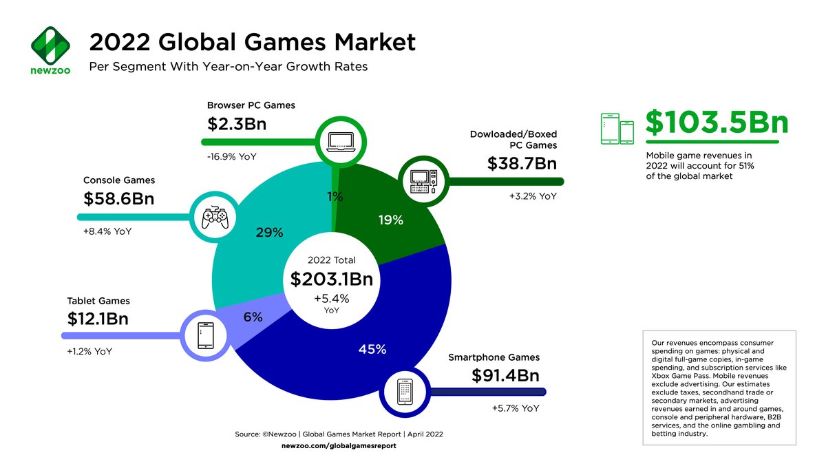 В 2022 году игровая индустрия пробьет две важных цифры, уверены аналитики Newzoo. Во-первых, объем игрового рынка впервые превысит $200 миллиардов: ожидается, что он достигнет $203.1 миллиарда.