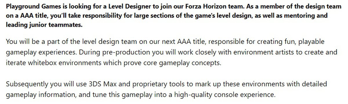 Разработчикам нужен дизайнер уровней в команду Forza Horizon, который будет заниматься не поддержкой пятой части серии, а присоединится к дизайн-команде «нашей следующей AAA-игры». Другие детали проекта в вакансии не приводятся.