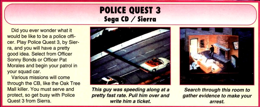 Версия для Sega CD, как видно из скриншотов, вышла отвратительной по качеству записанного видео, да и столь короткое видео, длящееся от силы 10 минут, записано на двух дисках (второй диск не работает)! Честно сказать, причина отмены, которая не разглашается – напрашивается сама-собой...