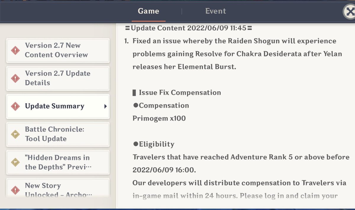 Разработчики Genshin Impact начали выплачивать игрокам компенсацию за ошибку, обнаруженную в обновлении 2.7. Речь идет о некорректном взаимодействии способности Е Лань, нового героя игры, с сегуном Райден.